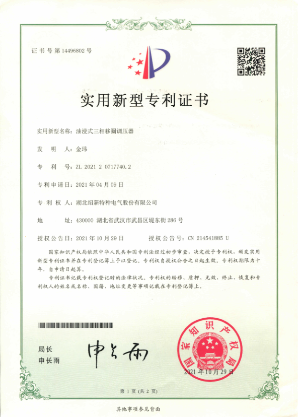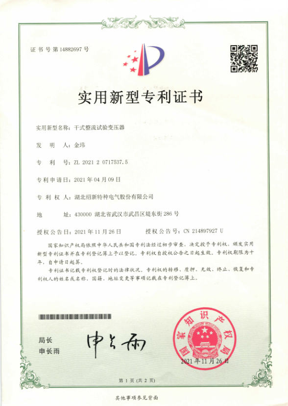 我公司擁有自主研發(fā)的多項(xiàng)專利技術(shù)。其中電氣試驗(yàn)設(shè)備類專利四項(xiàng),變壓器類制造專利三項(xiàng),調(diào)壓器制造專利兩項(xiàng),電阻柜專利一項(xiàng),以此為核心技術(shù)開發(fā)出多種新產(chǎn)品。